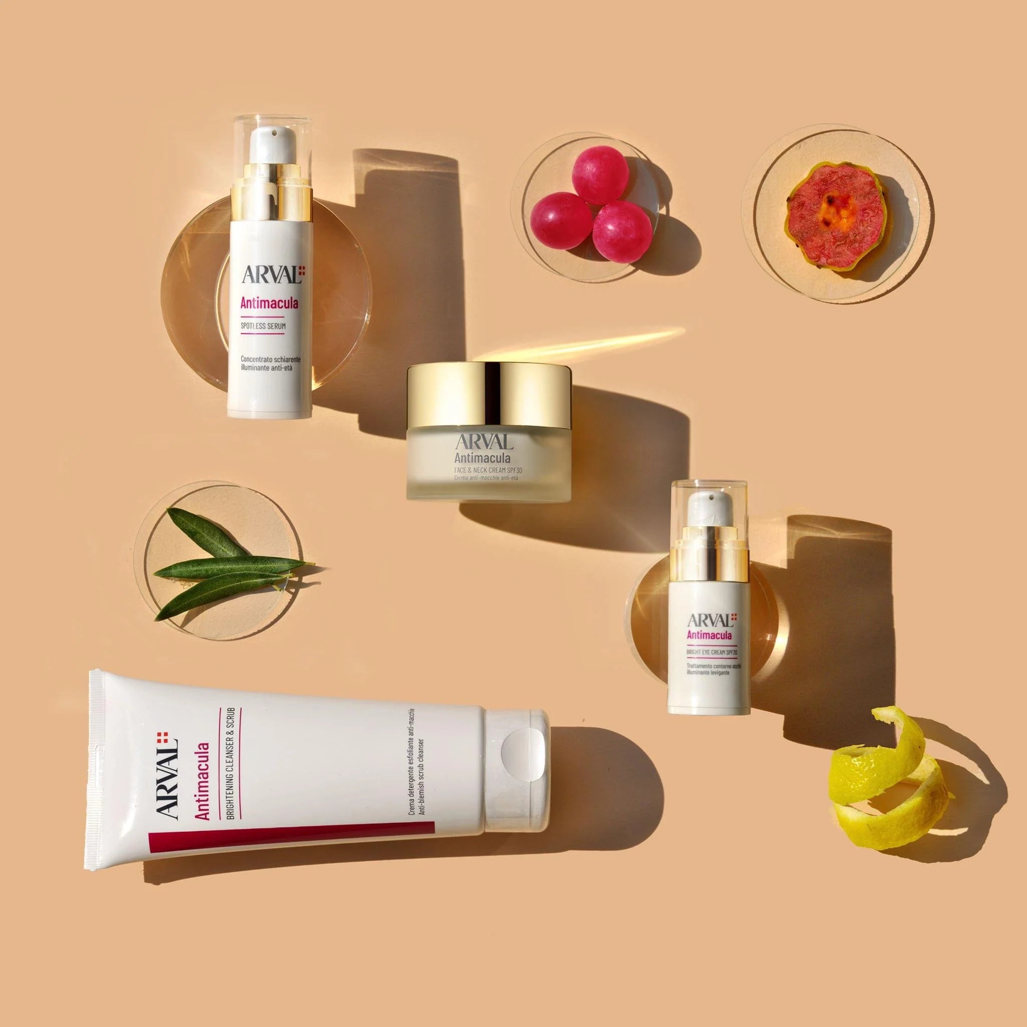 - Complesso derivato dalle foglie di uva ursina combinato con foglie di olivo, bucce di limone fermentate, foglie di rucola e fiori di fico d’India: proprietà sbiancanti e anti-irritanti.